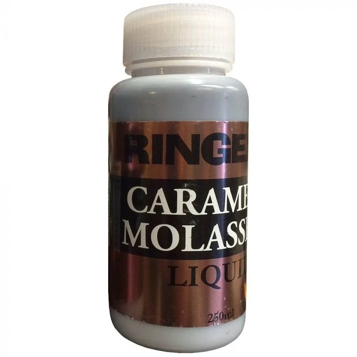 Ringers Caramel Melasse Vloeistof 250ml, Vloeibare melasse is een klassiek additief waar karper en brasem dol op zijn. De ziekelijk zoete smaak is perfect voor toevoeging aan grondvoer of voor gebruik met pellets voor diervoeders en expander. Geleverd in een fles van 250 ml.